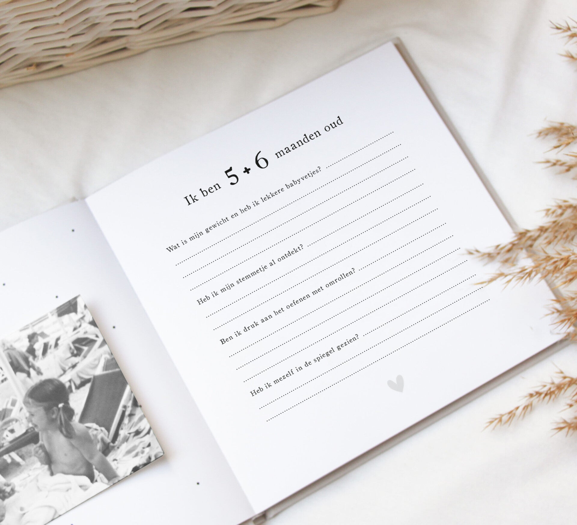 Vul het boek aan met leuke persoonlijke verhalen en bijbehorende foto’s, zodat je een mooi bewaarboek krijgt. Zo vertel je over de babytandjes, ons huis, leuke vriendjes, oppas, mooie momenten met de feestdagen, mijlpalen en nog veel meer. Natuurlijk sluit je het boek af met de eerste verjaardag!